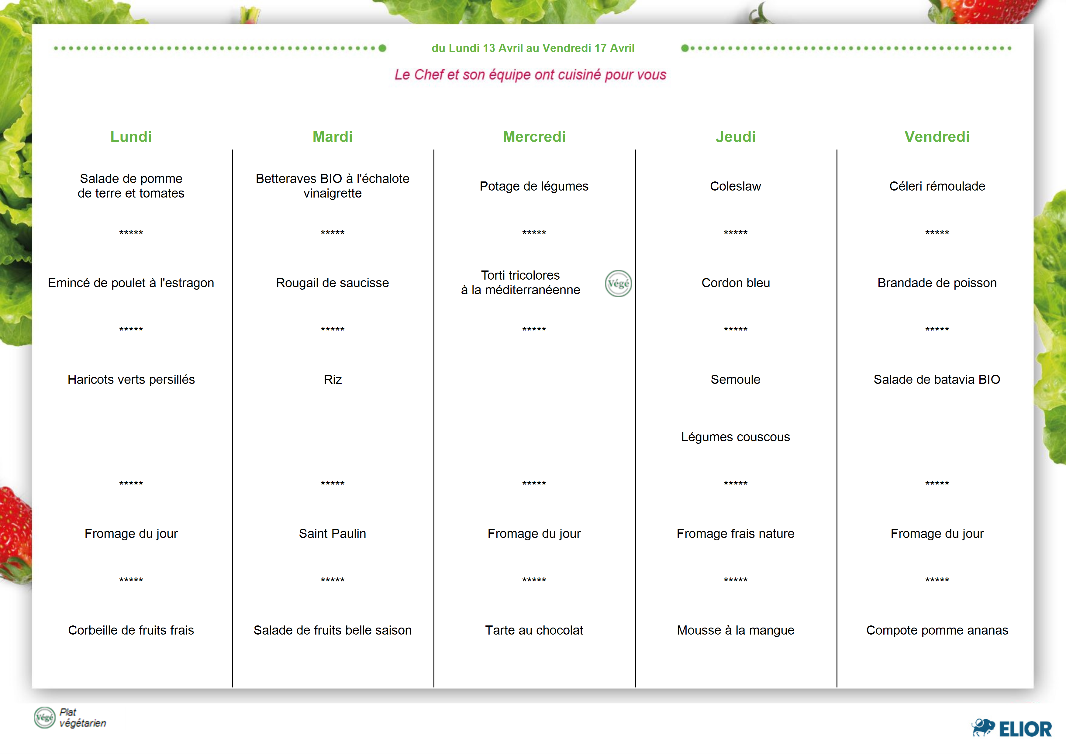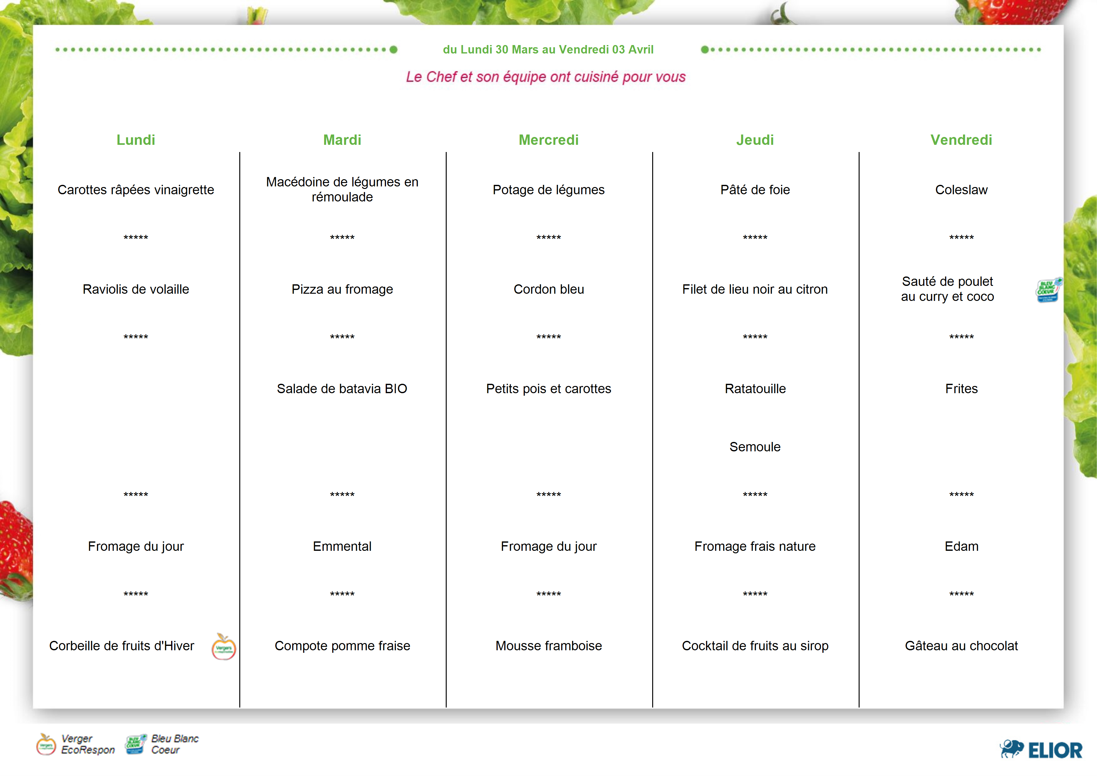 Les menus seront régulièrement portés à votre connaissance afin que chacun puisse prendre en compte l’alimentation fournie à vos enfants.