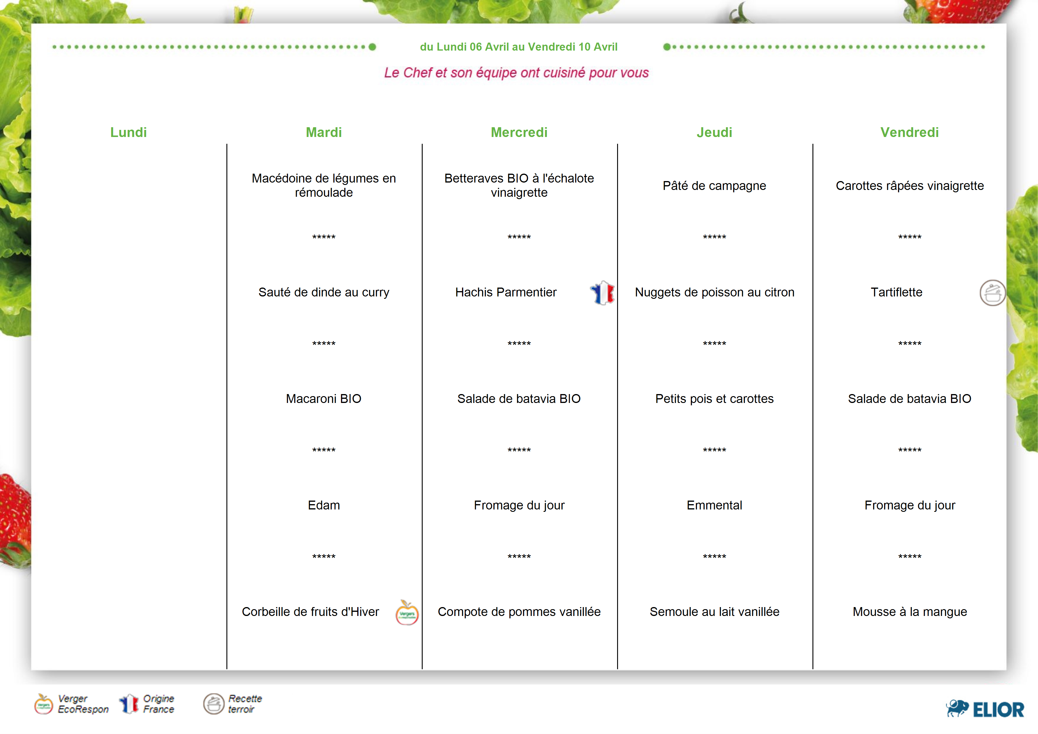 Les menus seront régulièrement portés à votre connaissance afin que chacun puisse prendre en compte l’alimentation fournie à vos enfants.