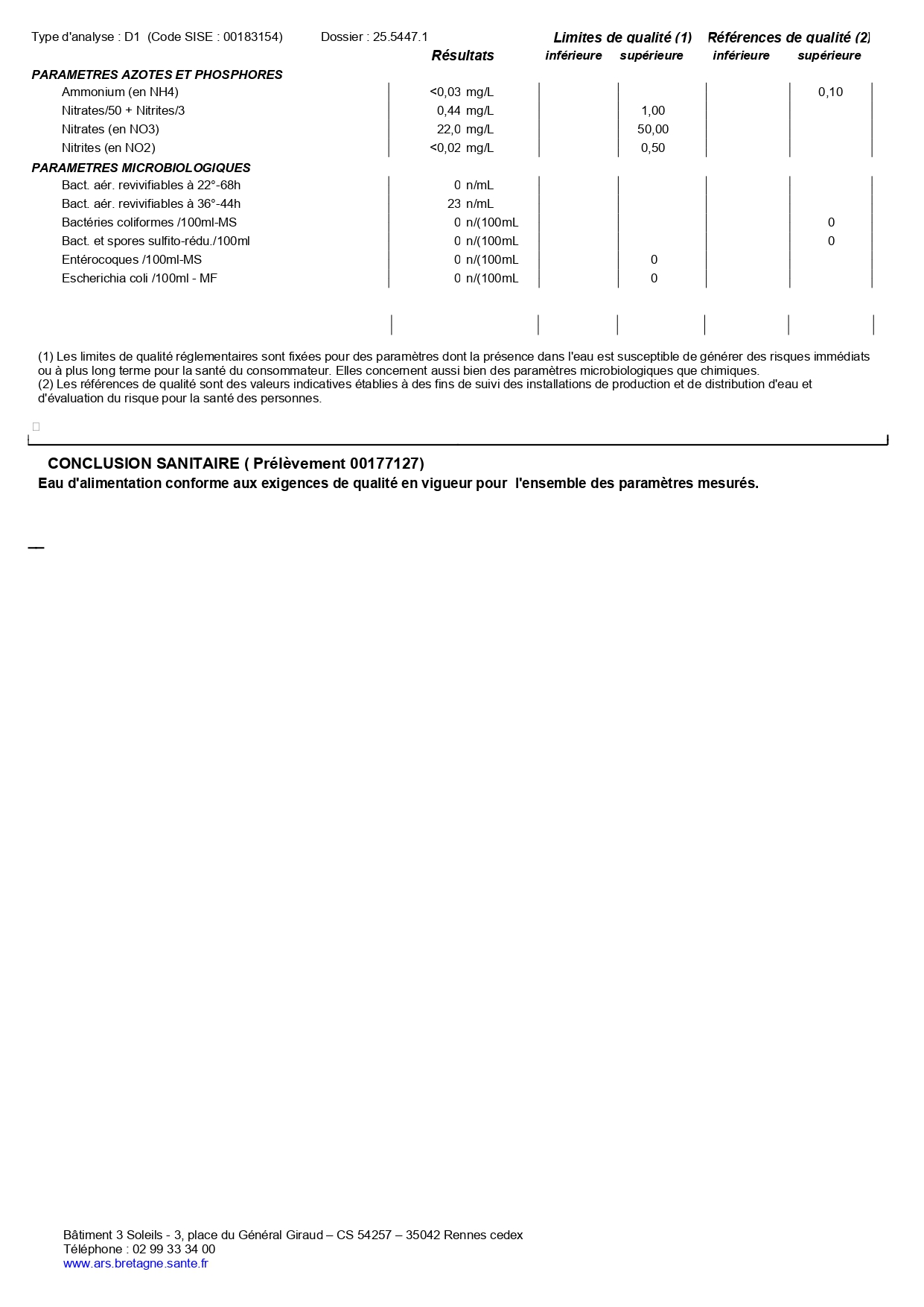 Conformément aux articles L1321-9 et R1321-22 du code de la santé publique, voici les derniers résultats d’analyses du contrôle sanitaire disponibles sur vos installations d’eau destinée à la consommation humaine.